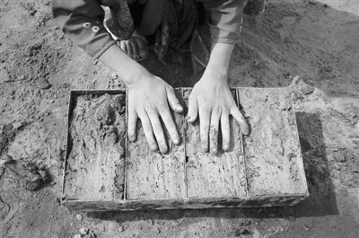 这是2011年10月9日拍摄的一名儿童在喀布尔郊区一个砖厂制砖的资料图片。 新华社发(艾哈迈德·马苏德摄)