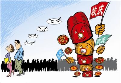 许多大学校庆,形式主义当头,尤其突出“庆”的色彩,兴师动众,行事高调,整个校园呈现一片歌舞升平之态。记者发现,在各大高校校庆期间,往往是“好消息不断”,带来无限“祥瑞”。