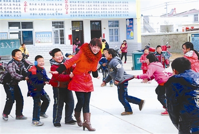 2月8日,南阳市卧龙区蒲山镇刘家埂移民新村中心小学的学生在校园里做游戏。