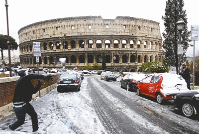 位于地中海北岸的意大利,属于典型的地中海气候,冬季本不甚寒冷。但因寒流过境,意大利5日迎来了近27年来的“最冷星期”,出现了首都罗马天降大雪、“水城”威尼斯运河结冰的罕见景象。意大利媒体7日称,强寒流和强降雪上周席卷亚平宁半岛,已在意大利造成25人死亡。在罗马一些区域,4日的积雪厚度达20厘米,多处旅游景点因被大雪覆盖而暂停开放。罗马上一次大量降雪,还是在1985年至1986年间。罗马市政当局派发大约4000把铁铲,以便民众清理露天广场和街道积雪。政府还设法紧急调动车辆在主要路段上撒盐,并动员军队参与扫雪,以减少事故发生。在意大利中部和南部,大雪导致当地电力供应中断,大约16万人受影响。意大利国家电力公司已派出1000名员工修理受损电力线路。