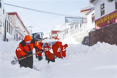 2月9日清晨,聂拉木县养护段工人在清理县城街道上的积雪。