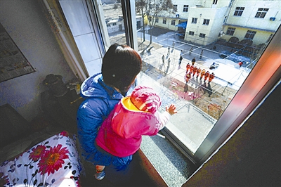 隔窗相望 2月2日上午11时40分,救护队员刘华的妻子许爱丽和孩子透过玻璃窗远远地观看训练。因为工作的特殊性,救援队实行每周144小时值班制,期间24小时坚守岗位。虽然家属院与训练场和办公区只有一墙之隔,但是,队员与家属却经常是隔窗相望。