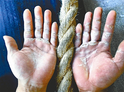 老茧 超大运动量和魔鬼训练致使队员们的手上、脚上的老茧不断增厚,每隔几个月就要割一次。教练杜希银介绍,有一次大家割下的老茧攒了半鞋盒。(杜希银 摄)