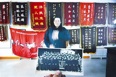 留影 张道生是1976年参加唐山大地震救援队37位抢险队员之一,将于今年3月退休。他取来了36年前那张37位抢险队员的合影,在荣誉室里让记者拍下了这张照片。