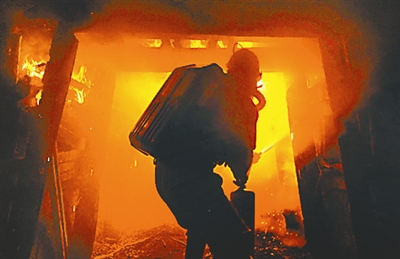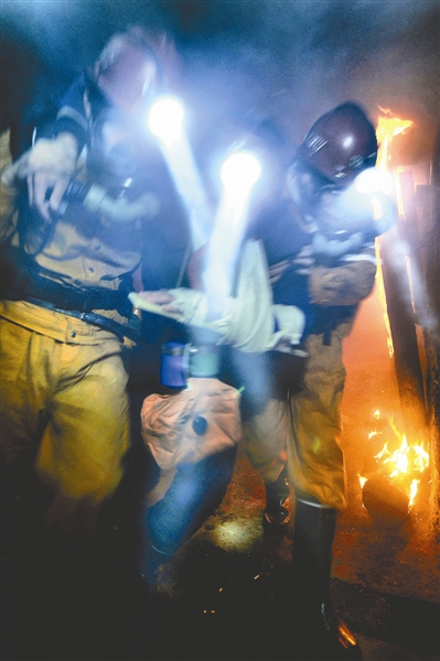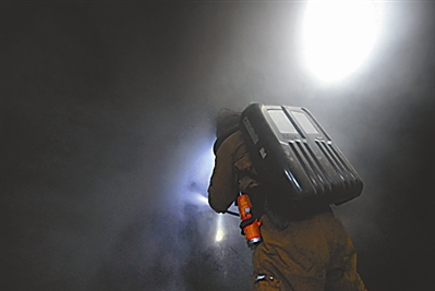 救援队员迎着井下大火一面灭火,一面前进。(摄于井下实战演习现场。)