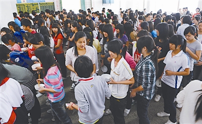 图为大化县第二中学的寄宿生在排队就餐。广西红水河中游的贫困地区大化瑶族自治县为解决境内七百弄山区和岩滩库区移民的子女教育难题,大化县采用“村办幼儿园、乡镇办小学、县城办中学”的三集中原则,对山里娃就学实施寄宿制管理教育。
