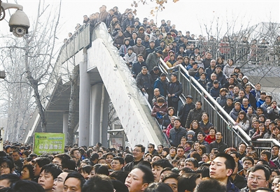 2月11日,郑州,考场外等候的家长站满了学校门口的广场和天桥。当日,“卓越人才培养合作高校联合自主选拔录取学业能力测试”在全国各考点同步开考,3.5万余名考生参加考试。“卓越人才培养合作高校”(简称“卓越联盟”)由9所以工科为特色的国家“985工程”大学组成。根据学业测试成绩,9所高校将各自进行特色测试或面试。 鸭舌 摄
