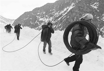 2月12日,中国移动西藏公司的线路抢修人员顶风冒雪徒步向通讯光缆损坏处运送光缆。