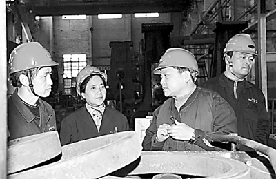 图为中国一拖公司工会主席任惠娟(左二)现场考证创新项目。 刘景梅 摄