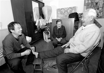 图为2月10日,修脚师滕国桐(左)在为93岁的马志勋老人修脚。新华社 张超群 摄