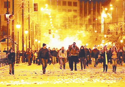 2月13日,数万名希腊民众聚集在位于雅典市中心的宪法广场示威,反对实施新一轮紧缩措施。部分示威者向警察投掷石块、汽油弹、矿泉水瓶、橘子和咖啡杯等,警察发射催泪弹并挥舞警棍驱散示威者。谢涛 供图