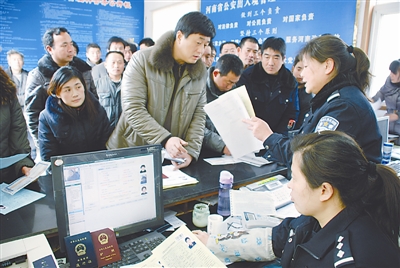 2月13日,河南省滑县公安局出入境管理民警正为准备前往德国、意大利、新加坡等国打工的王庄镇、枣村乡等6个乡镇的115名中青年集中办理护照,并向大家宣传国外生活安全防范注意事项和维权知识。