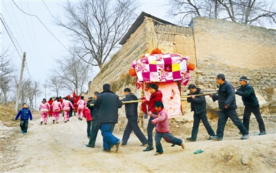 2月12日,山西永济长旺村,村民敲着锣鼓、抬着花轿穿梭在村里的巷道上。11日至12日,该村举行传统的社火活动。