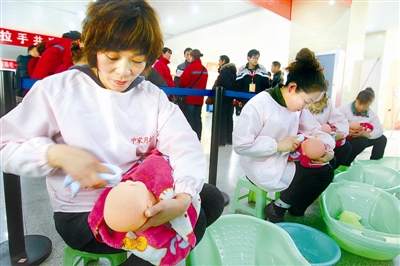 2月12日,郑州保姆供需见面会上,月嫂展示照料婴儿的技能。