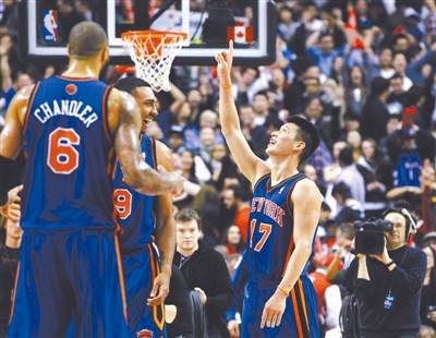 2月14日,尼克斯队球员林书豪(右)在比赛结束后庆祝胜利。当日,在2011-2012赛季NBA常规赛中,华裔球员林书豪在比赛结束前投进一个三分球,帮助纽约尼克斯队客场以90比87击败多伦多猛龙队,迎来球队六连胜。
