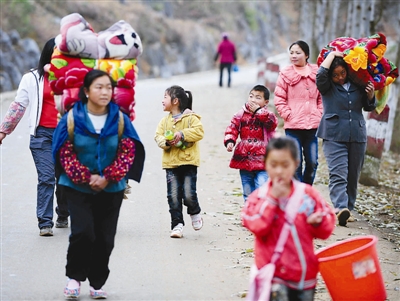 2月14日,在广西凤山县金牙瑶族乡,家长背着棉被送孩子上学。