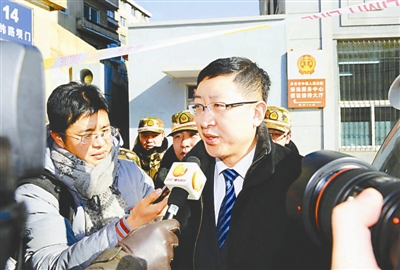 2月16日,陆俊的辩护律师(中)在一审宣判后接受媒体采访。新华社记者 李钢 摄