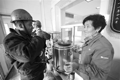 十多年来,矿工们换了一拨又一拨,陈栓英习惯了矿工们对她的称呼从 “陈大姐”渐渐变成“陈妈妈”、“陈大妈”。“看着他们觉得就像是自己的孩子一样,” 陈栓英说,“看着他们平安升井,就是我最大的幸福。”图为在屯兰矿井口服务站,陈栓英为矿工送上茶水。