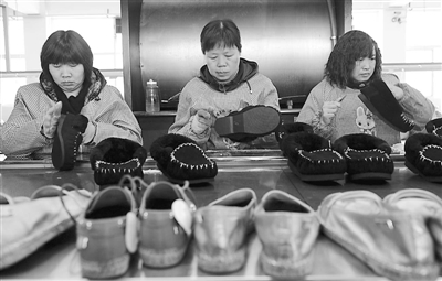 2月20日,武陟县产业集聚区一家鞋厂的女工在车间生产流水线上作业。