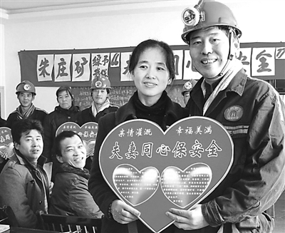 2月17日,安徽淮北矿业朱庄煤矿综预区一场别开生面的班前“”活动让职工兴趣盎然。这不,机采队职工郑永军(右)和妻子做了角色互换游戏,并与其他夫妻一起高兴地签订了心形《夫妻安全承诺书》。通过活动,妻子们更了解了丈夫井下工作的辛苦,职工则体会妻子照顾家庭的不容易,亲情的感召,收到“送一声叮咛,多一份关爱,保一班平安”的效果。 韩 荣 陈召松 摄