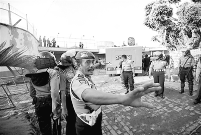 2月22日,印度尼西亚巴厘岛科洛布坎监狱发生暴动,囚犯向警察投掷石块,并纵火焚烧行政楼。安全部队和警察黎明时分进入监狱后被迫开火,3人受伤,已被送往医院。图为警察在监狱里守卫。吉平 供图