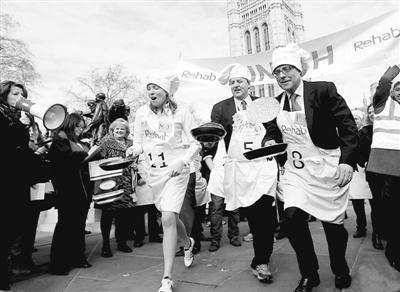 2月21日,英国一年一度的端煎饼赛跑比赛再度开跑,吸引了大批参赛者和观众。这个比赛已经举行了15年之久,该比赛由议员、新闻播音员以及普通民众参加,参赛者要穿着围裙,手持煎锅,一边掂着煎饼一边跑步。图为选手们在比赛中。阿健 供图