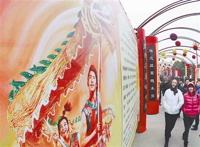 2月23日,在开封龙亭公园内,几位游客在“龙文化民俗展”的展区参观。