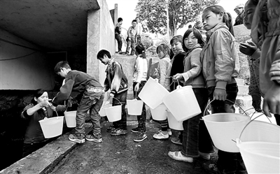 2月21日,云南省陆良县小百户镇老母村小学的学生们排队等待取水。目前,当地的旱情仍在持续。但当地干部表示,要保证师生用水,不让一个学生因旱受渴,不让一所学校因旱停课。