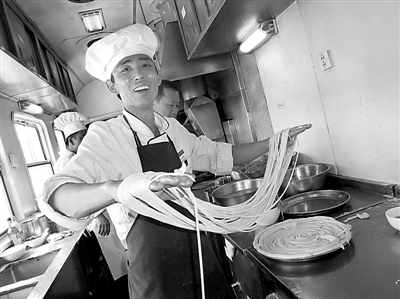 今年春运期间,为了满足穆斯林旅客在列车上的用餐需求,乌鲁木齐铁路局开行的列车全部改成清真餐车,为各次旅客列车餐车配备了清真炊具、餐具,并备足了清真餐料。为更大限度地满足各族旅客的用餐需要,列车饭菜品种从过去36个增加到了45个,特别是针对穆斯林旅客的饮食习惯,增加了新疆特色饭菜拉条子、羊肉抓饭、土豆烧牛肉等品种。陈美玲 乔俐灵 摄