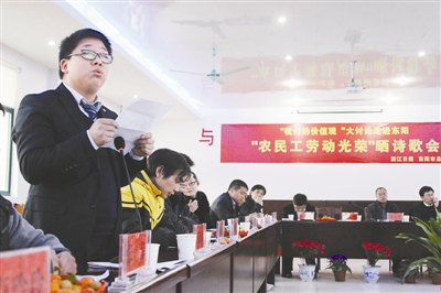 2月23日,一名“农民工诗人”在浙江东阳举行的“农民工劳动光荣”晒诗歌会上朗诵诗歌。