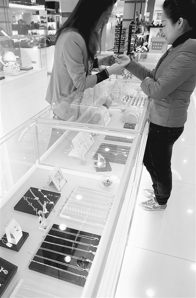 2月24日,顾客在上海市武宁路上的一家首饰店内选购铂金饰品。
