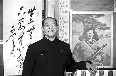 何朝海和贴在宿舍床头、陪伴自己走过了40多年的雷锋宣传画合影(2月15日摄)。