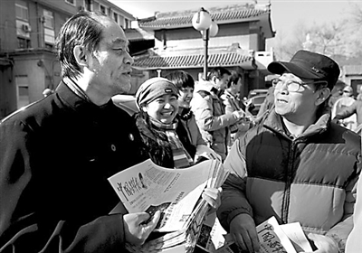 何朝海在发放《中国雷锋报》时,和一位市民谈论雷锋的故事(2月19日摄)。