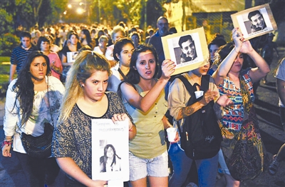2月25日,人们在阿根廷布宜诺斯艾利斯省的圣安东尼奥镇游行,悼念城铁事故中的遇难者。