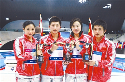 2月25日,2012年国际泳联第18届跳水世界杯在伦敦落幕,中国队包揽全部比赛的八枚金牌,获得最佳表现团队殊荣。图为中国队选手何姿、林跃、吴敏霞和邱波(从左至右)手捧奖杯合影。 新华社发(相梅 摄)