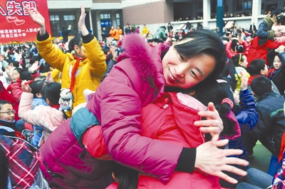 2月28日,在四川省南充市涪江路小学,老师和自己的学生拥抱。当日,涪江路小学千余师生共同上了一堂主题为《不要让爱你的人失望》的“感恩教育课”,旨在引领学生学会感恩父母,感恩老师,感恩时代,感恩国家,长大后更好地报效祖国。李向雨 摄