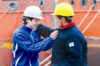 2月28日,受资助的威海艺校高美一班学生董博(左一)在造船厂看望马勇。