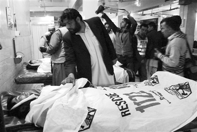 2月28日,在巴基斯坦白沙瓦一家医院,人们聚集在枪击事件遇害者的遗体旁。 新华社发(艾哈迈德·西迪克 摄)