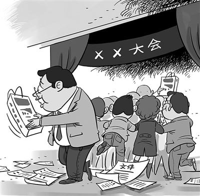 一堆堆一摞摞的文件,却套话连篇,字里行间读不出个重点;组团开会、旅游开会……一场会议参加下来,往往收获颇丰,各种会议成了满足形形色色个人需求的最佳借口,会议本身却成了念名单、 搞接见、拍合影的流水会,而凡开会必摆放鲜花、发放纪念品、搭建贵宾室、住高档酒店则更是成了例行程序,以至于同城的与会人员往往有被“住宿”的尴尬。文山会海之风是该好好整顿一下了,或许今日敷衍享乐的收获,恰是明日腐败堕落的忧伤。