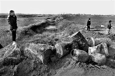 铁桶外锈迹斑斑,铁桶里液体气味令人作呕。这些铁桶显然是有人偷偷掩埋的,且掩埋过程相当仓促,以至于有些铁桶直接裸露在外。