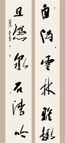 披览于月奎的书法作品,其微妙灵动尽在笔起笔落处。在苦心经营名碑名帖的同时,她对二王及秦汉书风涉猎不少,使她从中找到了书法艺术与自我性情的结合,在反复的碑帖转换过程中,培植了浓厚的笔墨根基,找到了自己独特的行笔技法。她用篆书的用笔写隶书,苍茫浑厚,古朴典雅,从共性中寻找适合自己性情的独特的个性表达语言,既不墨守成规,也不因袭故我,实现了变化中的自我完善,“法度”中的从心所欲。在创作中,她对字的点画粗细,用笔轻重十分讲究对比和谐,在平稳厚重的基调中显示出雄强跃动的力量,作品的阳刚之气油然而生。她还以行草书之灵动摇曳,融入魏碑墓志的奇趣稚朴,走笔率意,天真烂漫,通过对行笔技法的有效把握,墨色的浓淡枯润变化,空间的分割布白,达到节奏明快,展现自我性情。