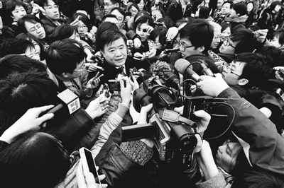 3月3日下午,前来参加全国政协十一届五次会议的委员们一来到会场便遭到记者们的“围堵”。全国政协委员、卫生部部长陈竺在里三层外三层的记者圈里就医疗改革等问题回答记者们的提问。本报记者 张宪 摄