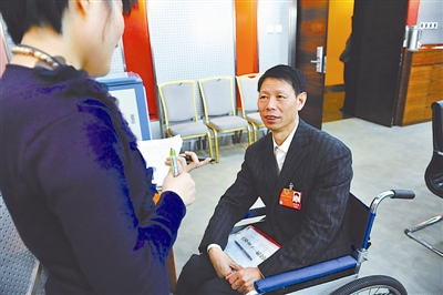 工会界全国政协委员王树明是中国网通集团吉林省通信公司长春市分公司党群工作部干事,是一位残疾人,多年来他带头帮助残疾人,帮他们树立乐观生活态度,掌握自己的命运,被人们誉为“轮椅上的雷锋”。3月4日,王树明委员表示,雷锋精神永远不会过时,而且有着强烈的时代感。本报记者 张宪 摄