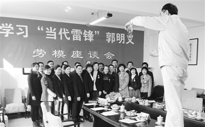 3月7日上午,郭明义走进劳模班和戴着劳模奖章的学员们交流,这是郭明义站在桌上给劳模班合影。本报记者 许之丰 摄