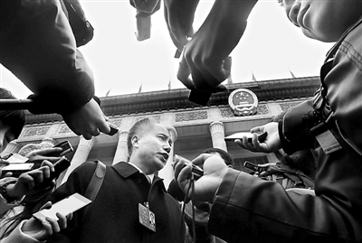 3月5日上午,全国人大代表、西安外事学院院长黄藤被众多记者包围,就教育问题展开“轰炸式”采访。 他认为地区间教育资源的不均衡是导致西部教育发展落后的主要原因。因此,在资金的投入上应该重点优先考虑中西部及少数民族聚居地,否则东西部的贫富差距将进一步拉大。本报记者 杨登峰摄