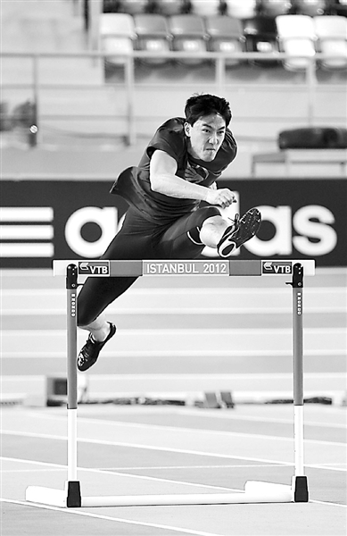 3月8日,中国选手刘翔在训练中跨栏。当日,中国选手刘翔针对起跑和过栏进行了训练。2012年国际田联室内世锦赛将在3月9日到11日在土耳其的伊斯坦布尔进行。新华社记者 马研 摄