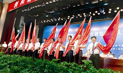 在西部大庆劳动竞赛誓师动员大会上向参赛单位代表授旗
