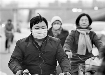 3月12日下午6时,戴口罩的市民骑车经过北京二环路,当时手机显示空气污染指数(PM2.5)为160,属于不健康天气,不适宜户外活动。