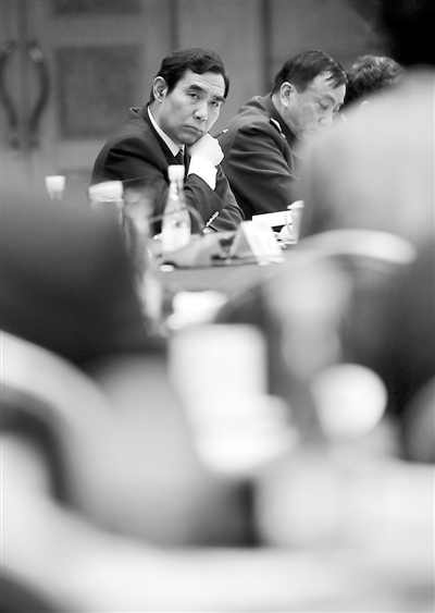 3月12日,最高人民法院副院长景汉朝认真听着河北代表团代表的发言。当天,两会各代表团全体会议审议“两高”报告,最高人民法院和最高人民检察院都派出工作人员到各代表团旁听。本报记者 杨登峰摄