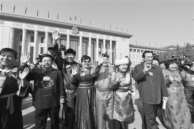 3月13日上午,全国政协十一届五次会议在北京闭幕,几位少数民族委员高兴地走出人民大会堂。他们将回到各自的工作岗位上,为当地经济社会的发展再做贡献。本报记者 张宪 摄